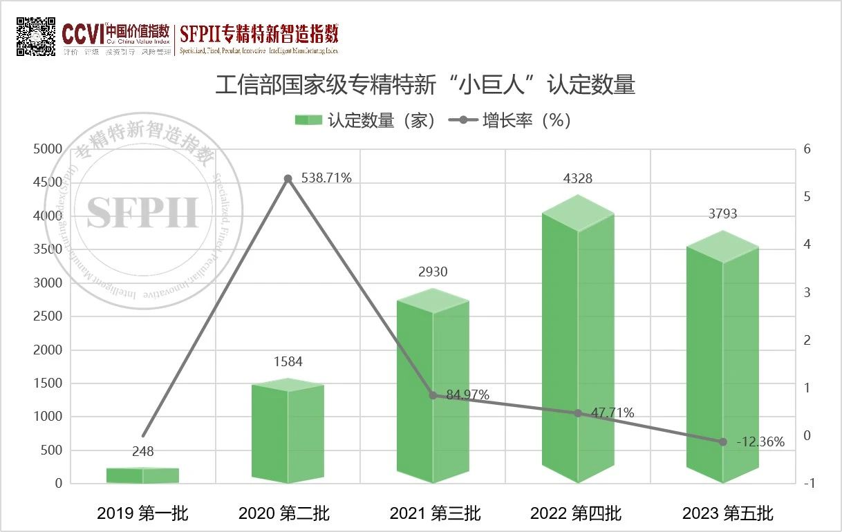SFPII專精特新智造指數跟蹤顯示,2023年工信部第五批國家級專精特新“小巨人”企業認定共計3793家,該批申請數量創歷史新高,合計約17000家,但是通過率創歷史新低,約22.3%。截至2023年底,全國共有12756家“專精特新”小巨人企業,提前并超額完成了“到2025年,培育1萬家國家級專精特新‘小巨人’企業”的目標”。