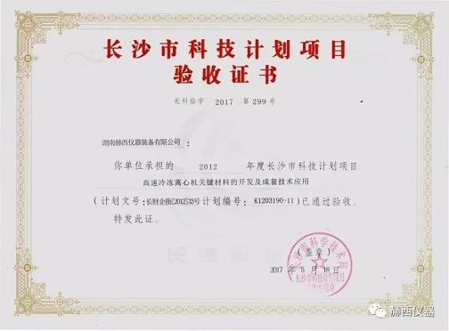 近日,湖南赫西儀器裝備有限公司收到長沙市科學技術局發(fā)來的驗收證書。我公司承擔的2012年度長沙市科技計劃項目:高速冷凍離心機關鍵材料的開發(fā)及成套技術應用(計劃文號:長財企指【2012】33號 計劃編號:K1203190-11)已通過驗收。