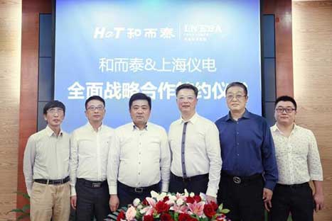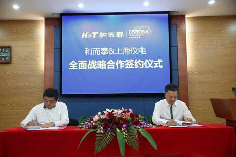 和而泰董事長(zhǎng)/總裁劉建偉與上海儀電科儀董事長(zhǎng)/黨委書(shū)記/總經(jīng)理湯志東簽署協(xié)議