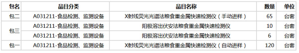 湖南省糧食局 糧食重金屬快速檢測設備(第二批)采購預算為2760萬元,分為三包,采購明細如下表所示。