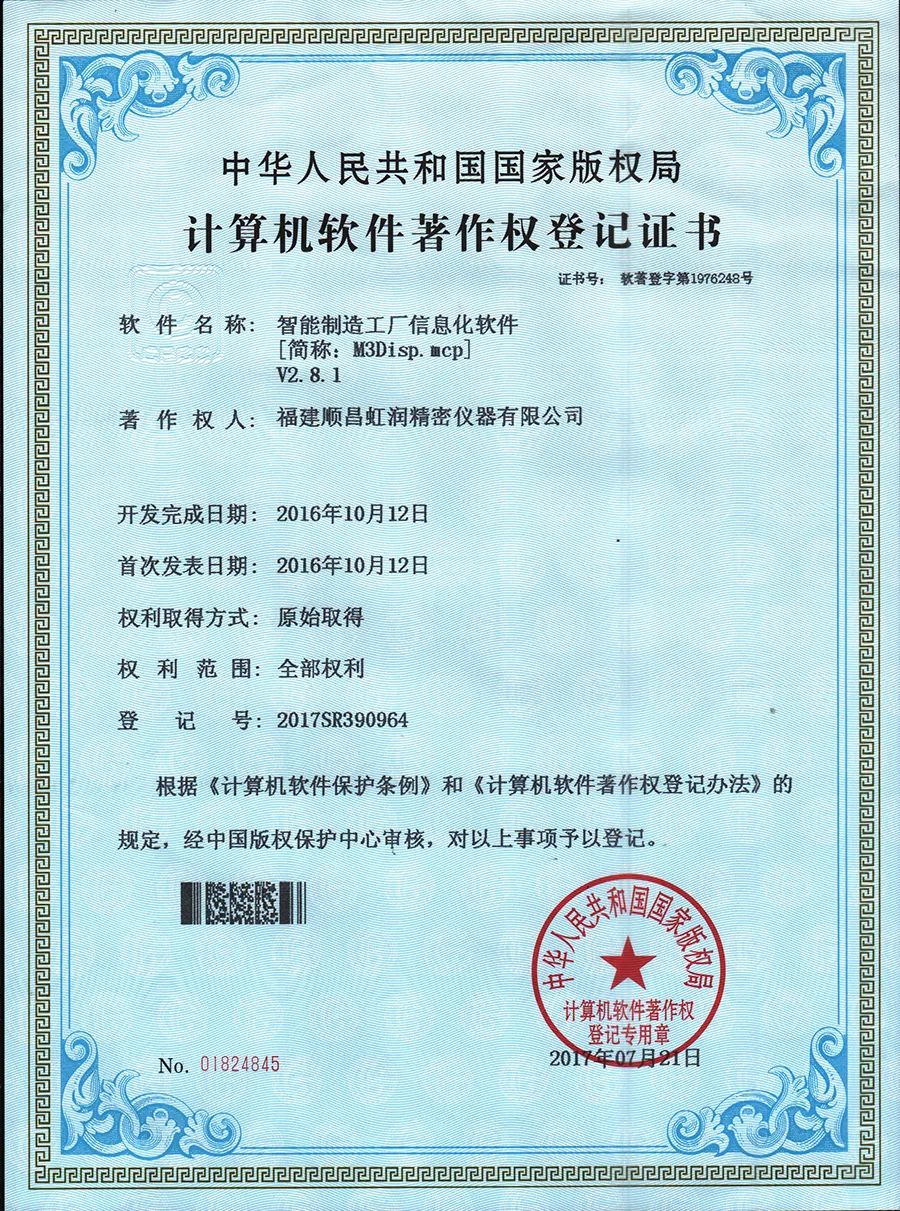 虹潤公司再傳喜訊,由虹潤公司自主開發(fā)的智能制造工廠信息化軟件榮獲國家軟件著作權版權證書。