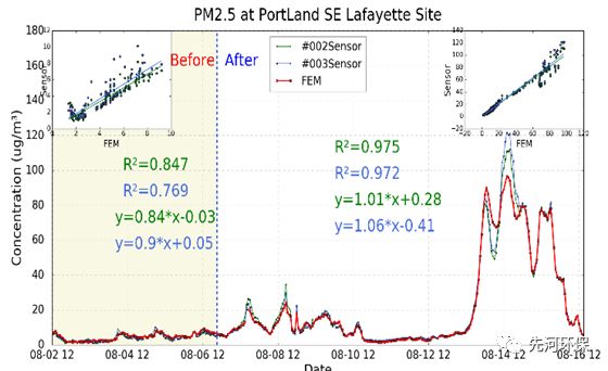 下圖為細粒子(PM2.5)傳感器(藍色和綠色)與美國國控點數據(紅線)的對比圖