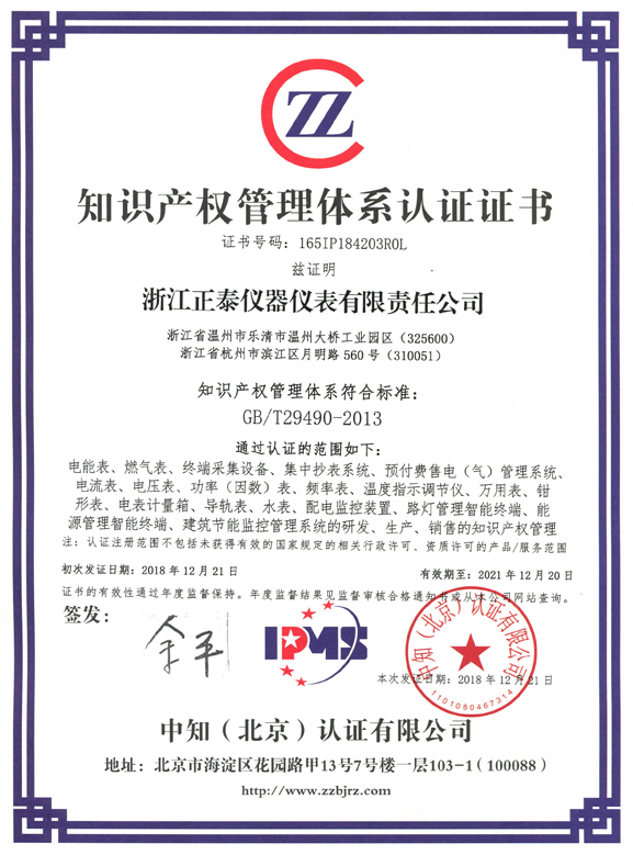 12月21日,浙江正泰儀器儀表有限責(zé)任公司(以下簡稱“正泰儀表”收到了國內(nèi)權(quán)威知識產(chǎn)權(quán)認(rèn)證機(jī)構(gòu)中知(北京)認(rèn)證有限公司頒發(fā)的知識產(chǎn)權(quán)管理體系認(rèn)證證書,這意味著正泰儀表公司在知識產(chǎn)權(quán)領(lǐng)域獲得到重要認(rèn)可,在知識產(chǎn)權(quán)方面得到進(jìn)一步規(guī)范以及綜合競爭力進(jìn)一步提升。