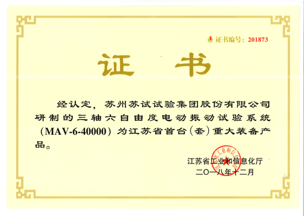 蘇州蘇試試驗(yàn)集團(tuán)股份有限公司三軸六自由度電動(dòng)振動(dòng)試驗(yàn)系統(tǒng),經(jīng)江蘇省工業(yè)和信息化廳認(rèn)定為江蘇省首臺(tái)(套)重大裝備產(chǎn)品,為有效支撐和服務(wù)中國制造轉(zhuǎn)型升級(jí)、實(shí)現(xiàn)高質(zhì)量發(fā)展,提供了先進(jìn)的質(zhì)量可靠性研發(fā)試驗(yàn)裝備。