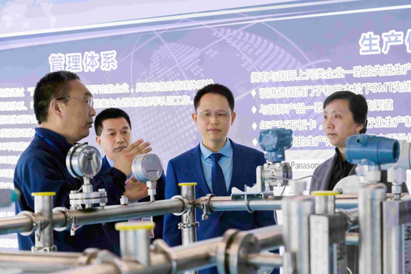 王文序副省長一行先后參觀了生產大廳和展廳。方壘向王文序副省長簡要介紹了和利時的發展歷程,在火電、石化、高鐵、核電等行業的業績和市場地位及杭和在集團中的分工、業務規模、生產狀況等。同時結合本次調研主題,方壘就杭和在電氣儀表領域業務整體情況做了重點介紹與交流。王文序副省長詳細詢問了儀器儀表產品的研發制造及應用情況,并仔細觀摩了儀器儀表相關產品。杭系公司副總經理趙愛兵就和利時儀表業務具體情況、儀表產品在整個控制系統中的重要性及在工業現場中的不同應用進行了詳細講解。