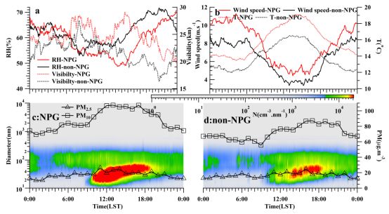 NPG和non-NPG天PM2.5濃度相差不大,分別為17.3和16.9μg·m-3;但是NPG天PM10和BC濃度較高,分別是non-NPG天的1.2倍和1.28倍。此外, NPG事件主要影響10-60nm數濃度分布和100-300nm表面積濃度分布。