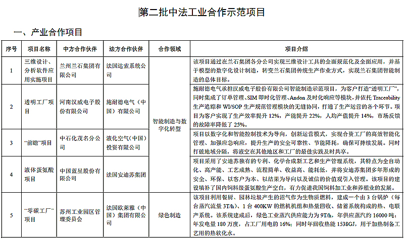 為深入貫徹中法兩國元首關(guān)于加強產(chǎn)業(yè)戰(zhàn)略全方位對接的重要共識,落實第六次中法高級別經(jīng)濟財金對話有關(guān)“發(fā)布第二批智能制造、綠色制造、教育培訓等領(lǐng)域的中法工業(yè)合作示范項目清單”的政策成果,打造一批中法工業(yè)合作先進典型,在工業(yè)和信息化部與法國經(jīng)濟和財政部企業(yè)總署指導下,工業(yè)和信息化部國際經(jīng)濟技術(shù)合作中心與法國未來工業(yè)聯(lián)盟共同征集評選了第二批中法工業(yè)合作示范項目,并于7月5日在中法產(chǎn)業(yè)合作圓桌會上正式發(fā)布。