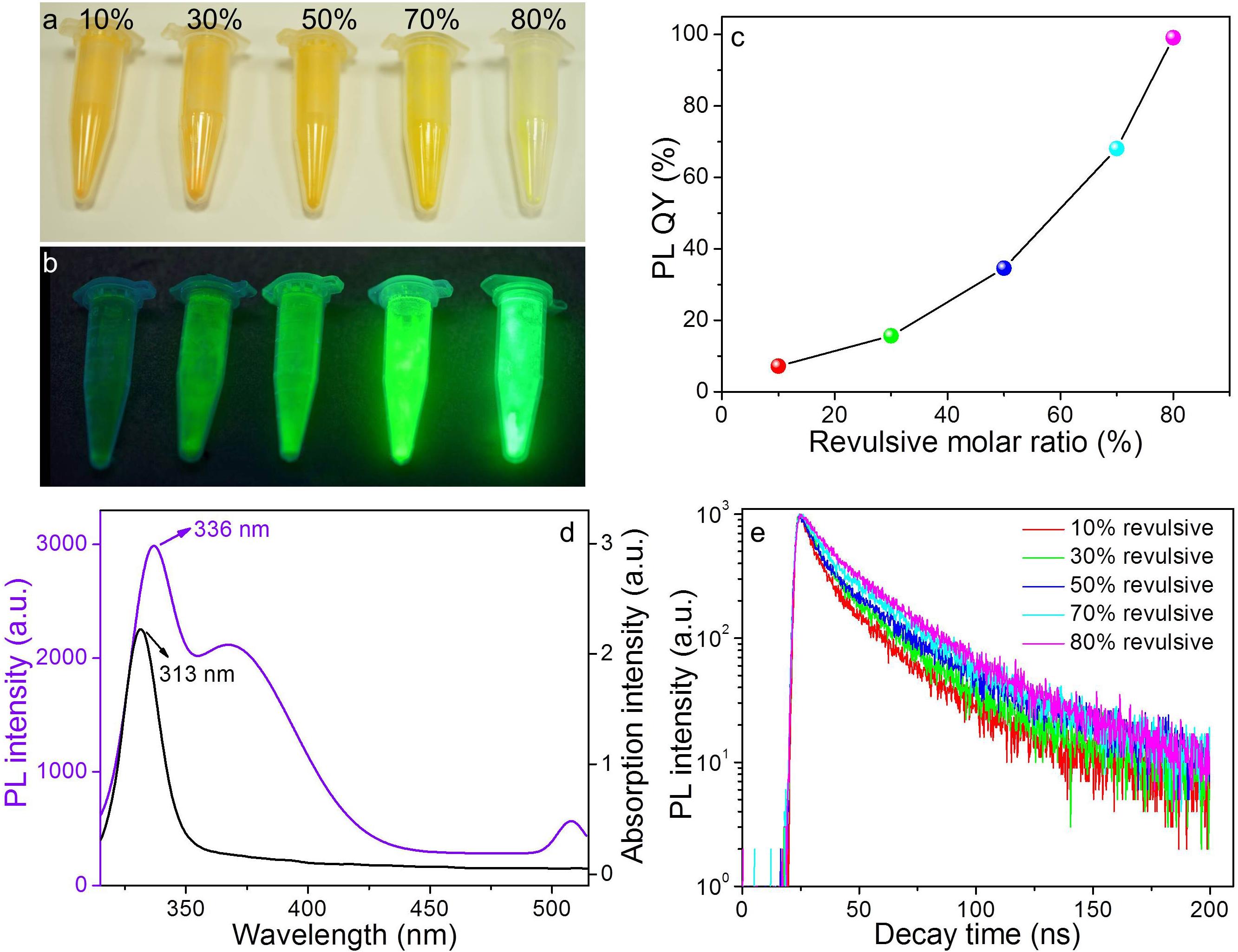 不同比例ZnBr2誘導劑作用下CsPbBr3和Cs4PbBr6鈣鈦礦納米晶在自然光(a)和紫外燈照射下(b)的照片、熒光量子效率(c)和熒光壽命(e);Cs4PbBr6鈣鈦礦納米晶的吸收以及熒光發射光譜(d)