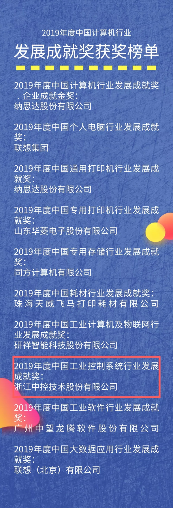《2019年度中國計算機行業(yè)發(fā)展成就獎》是中國計算機行業(yè)為表彰和激勵在產業(yè)發(fā)展過程中櫛風沐雨、砥礪前行、開拓創(chuàng)新的成功企業(yè),促進我國信息產業(yè)健康有序發(fā)展設立的獎項。最終評定10家獲獎企業(yè),各子行業(yè)只評選一家獲獎企業(yè)。