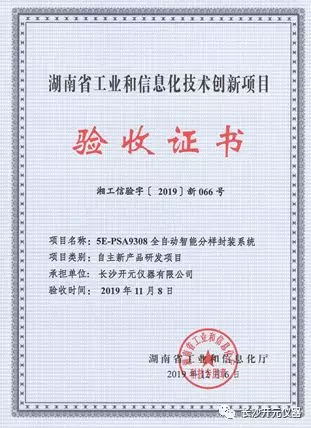 2019年12月6日,開元儀器自主研發的四款新產品獲得湖南省工信廳頒發的驗收證書。11月8日湖南省工信廳和長沙市工信局在長沙開元儀器有限公司主持召開了新產品驗收會。會議邀請了電力、煤炭、質檢等行業領域及高校和科研院所的30多位專家,對由開元儀器自主研發的機器人智能化驗系統、智能全自動制樣系統、全自動智能存查樣系統和全自動智能分樣封裝系統四款新產品進行了技術創新評估和驗收。