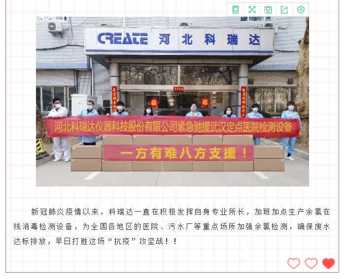 2月9日,第一時間與園區(qū)領(lǐng)導申請復工復產(chǎn)。加班加點,生產(chǎn)余氯在線分析儀,2月12日派物資專車馳援武漢,2月13日到達龔家?guī)X收費站,完成無接觸交貨;