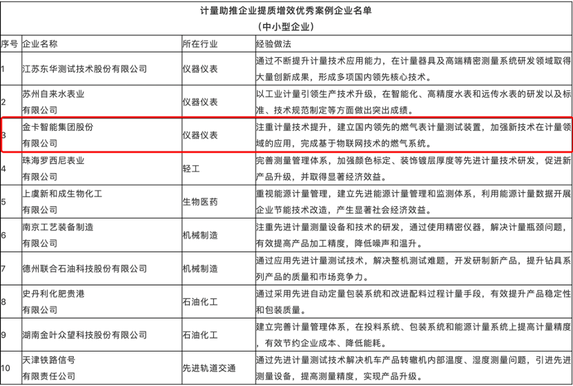 近日,國家市場監督管理總局計量司下發《市場監管總局辦公廳關于宣傳推廣計量助推企業提質增效典型案例的通知》,要求各地加大對企業計量工作典型做法和經驗案例的宣傳推廣,其中金卡智能等30家企業“榜上有名”。
