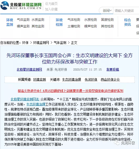 兩會期間,北極星環(huán)境監(jiān)測網(wǎng)特邀先河環(huán)保(股票代碼:300137)董事長李玉國通過網(wǎng)絡媒體向“兩會”建言獻策。報道發(fā)出后,立即引發(fā)廣泛關(guān)注。