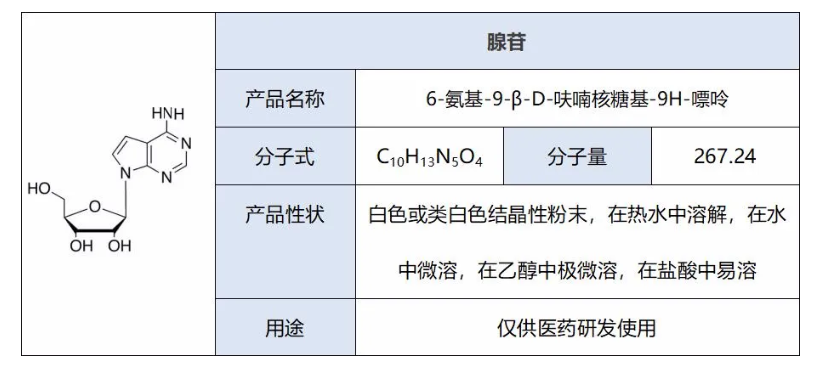 腺苷作為天然核苷酸,是機體代謝的中間產物,也是體內重要活性成分之一。腺苷做成的注射液1989年美國首次上市。腺苷(Adenosine AD)即腺嘌呤核苷,是機體RNA的代謝產物,屬于生物小分子化合物,它是一種內源性核苷,能參與血管神經舒張活動,具有抗心律失常的功效。在中樞神經系統中,它對神經傳遞的調節及對抵抗缺血性與疾病性神經傷害等方面具有重要作用。