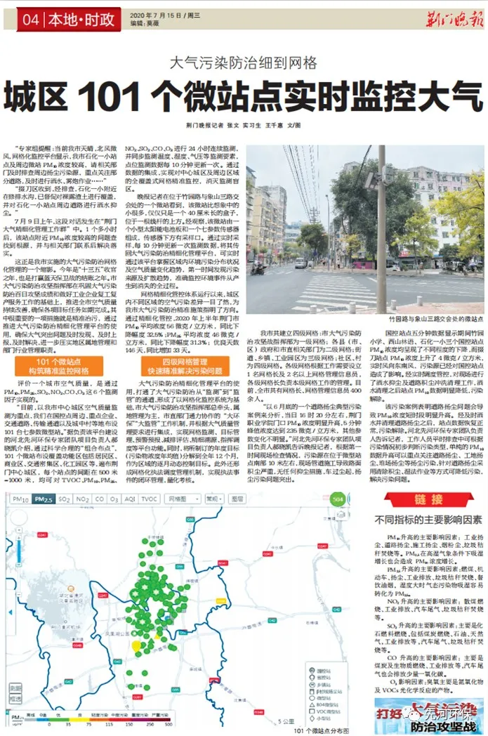 近日,《荊門晚報》以“大氣污染防治細到網(wǎng)格:城區(qū)101個微站點實時監(jiān)控大氣”為題刊發(fā)報道,為先河“大氣污染防治精細化管理平臺”點贊!
