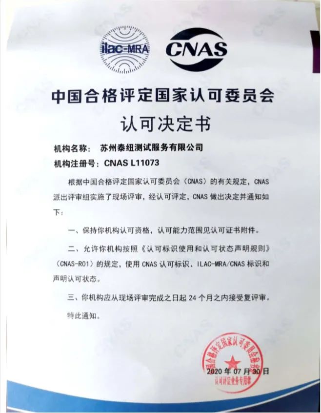 泰紐測試將嚴格執行CNAS實驗室認可的相關要求,更加規范和完善實驗室體系建設,促進公司健康有序發展,以更優的質量、更高的標準為客戶提供科研服務。