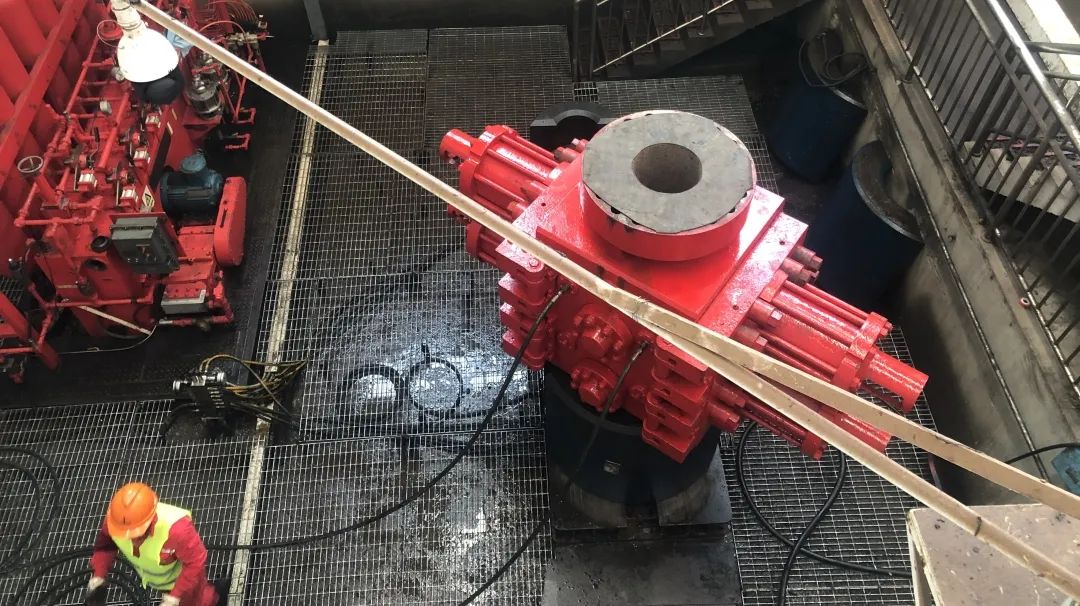 隨后開始剪切試驗,最終在控制油壓24.2MPa的情況下成功剪斷高強度鉆桿;剪切后還按照API標準進行了高低壓水密封試驗,在工作壓力105Mpa下保壓10分鐘,壓力保持穩(wěn)定,說明剪斷鉆桿后,防噴器剪切刀具和密封情況完好;與會領(lǐng)導和專家對神開防噴器剪切測試結(jié)果表示非常滿意,至此神開服役了12年的105Mpa防噴器,剪切性能經(jīng)受住了油田“大考”。