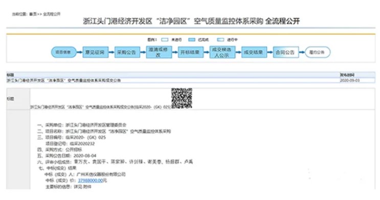 9月3日,廣州禾信儀器股份有限公司(以下簡稱"禾信儀器")以3798·8萬元中標浙江頭門港經(jīng)濟開發(fā)區(qū)“潔凈園區(qū)"空氣質(zhì)量監(jiān)控體系頂目,此次中標的是以分布式多通道快速質(zhì)譜儀為核心,并通過多種質(zhì)譜技術手段構建臨海醫(yī)化園區(qū)在線監(jiān)測預警溯源體系,實現(xiàn)園區(qū)有有害氣體的快速預警、惡臭異味氣體的精準溯源,提高園區(qū)精細化管理水平。