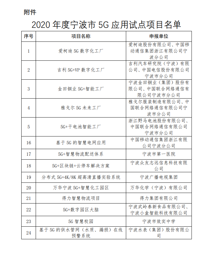 根據(jù)《關(guān)于征集2020年寧波市5G應用試點項目的通知》(甬經(jīng)信箋[2020]284號)要求,經(jīng)過單位申報、部門推薦、專家實地考察評審,寧波水表(集團)股份有限公司(以下簡稱:寧水集團)的“基于5G的供水管網(wǎng)(水質(zhì)、漏損)在線預警系統(tǒng)”等24個項目被列入2020年度寧波市5G應用試點項目名單,并于2021年1月26日至2021年2月1日進行了網(wǎng)上公示。該項目主要內(nèi)容有管網(wǎng)綜合感知終端/多參數(shù)水表(智能水表3.0產(chǎn)品)、5G通信終端、管網(wǎng)(水質(zhì)、漏損)在線預警平臺等關(guān)鍵技術(shù)的研制,以及工程化應用等。