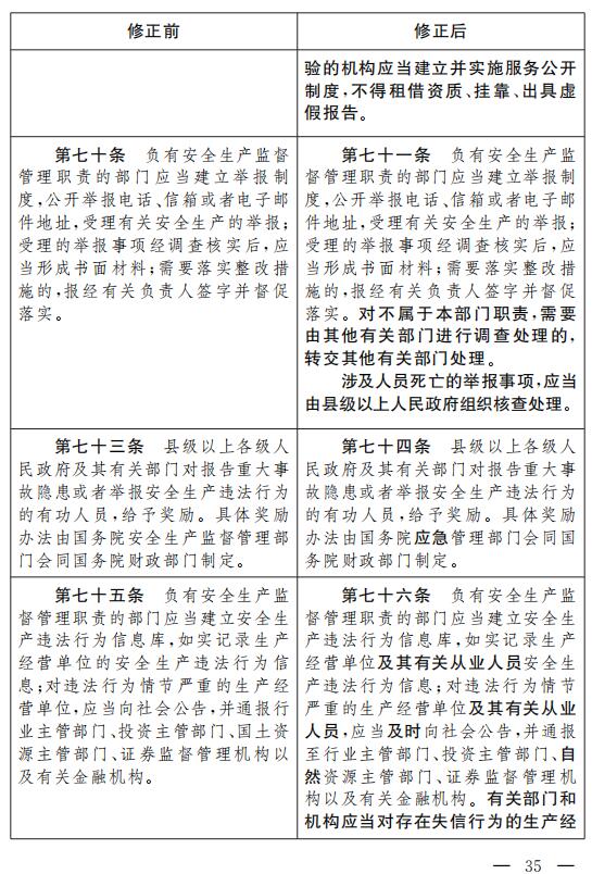 十七、將第七十條改為第七十一條,修改為:“負有安全生產監督管理職責的部門應當建立舉報制度,公開舉報電話、信箱或者電子郵件地址,受理有關安全生產的舉報;受理的舉報事項經調查核實后,應當形成書面材料;需要落實整改措施的,報經有關負責人簽字并督促落實。對不屬于本部門職責,需要由其他有關部門進行調查處理的,轉交其他有關部門處理。