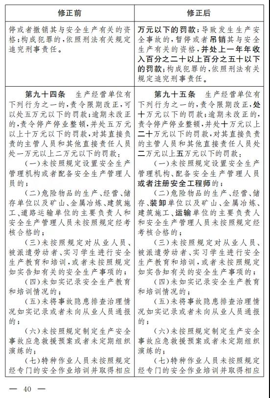二十六、將第九十四條改為第九十五條,修改為:“生產經營單位有下列行為之一的, 責令限期改正, 處十萬元以下的罰款;逾期未改正的,責令停產停業整頓,并處十萬元以上二十萬元以下的罰款,對其直接負責的主管人員和其他直接責任人員處二萬元以上五萬元以下的罰款: