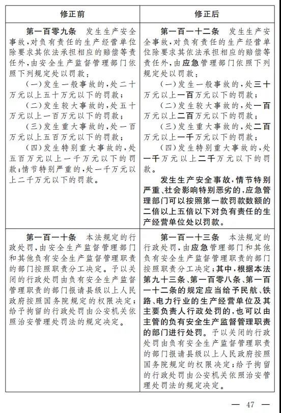 三十四、將第一百零九條改為第一百一十二條,修改為:“發生生產安全事故,對負有責任的生產經營單位除要求其依法承擔相應的賠償等責任外,由應急管理部門依照下列規定處以罰款: