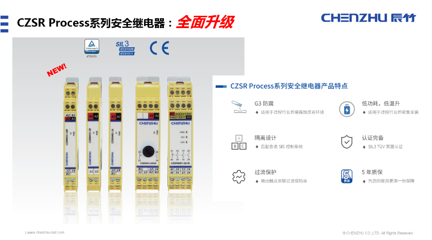 此次辰竹發布的新一代CZSR Process系列安全繼電器,擁有以下特點: