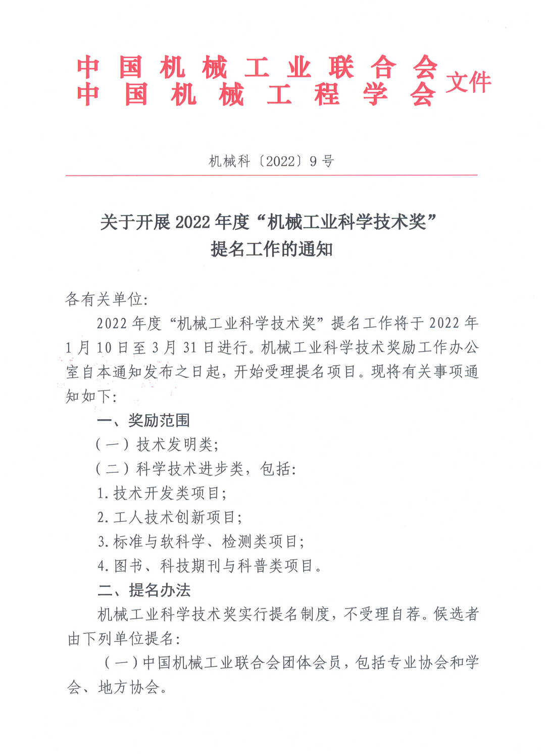 關(guān)于開(kāi)展2022年度“機(jī)械工業(yè)科學(xué)技術(shù)獎(jiǎng)”提名工作