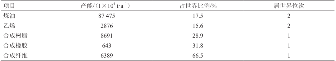 我國石化工業經過數十年的發展,整體規模已躋身世界前列。2019 年,我國已成為世界第二石化大國,主要產品產能和產量穩居世界前列(見表 1);石油和化工行業共有規模以上企業 26 271 家,營業總收入為 12.27 萬億元(占全國相應總額的 11.6%),利潤總額為 6683.7 億元(占全國相應總額的 10.8%),資產總額為 13.4 萬億元;全行業營業收入利潤率為 5.45%。我國石化工業發展取得的重大成就,為實現高質量發展打下了堅實基礎。