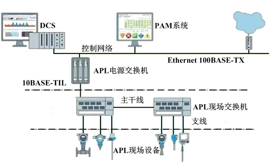 圖1中,APL電源交換機向上可通過Ethernet 100BASE-TX控制網絡與DCS或云應用相連,向下可通過兩線制主干線(Trunk)連接多臺APL現場交換機。每臺現場交換機可提供最多50個兩線制支線(Spur)端口?;趦删€制的主干線和支線電纜的最大長度取決于由 IEEE 802.3cg中定義的發射信號強度,分別可達 1 000 m和200 m,且支持環形冗余連接方式。