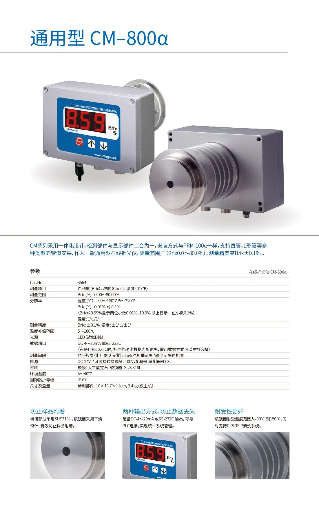 ATAGO(愛拓)在線折光儀——CM-800α,直接安裝于生產(chǎn)/排放管道,采用折光法原理,通過在線傳感器實時監(jiān)測管道內(nèi)液體Brix值(可溶性固形物),測量精度高(Brix ±0.1%),測量范圍廣泛(Brix 0.0~80.0%),已廣泛應用于食品、生化、制藥、制糖、飲料、化工等行業(yè),為原液、提取、混和、清洗等實現(xiàn)多流程濃度監(jiān)測,有效保證產(chǎn)品的品質(zhì)統(tǒng)一性,并全面提高企業(yè)自動化生產(chǎn)水平!