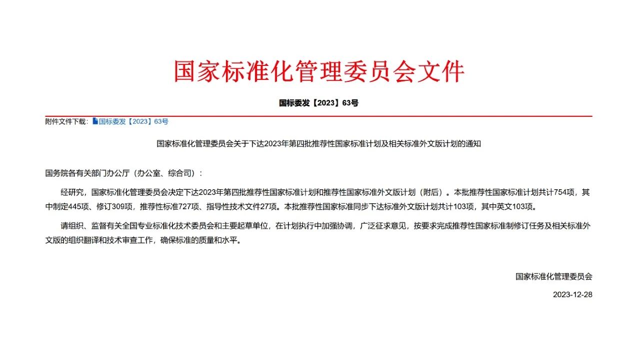 2023年12月28日,國(guó)家標(biāo)準(zhǔn)化管理委員會(huì)決定下達(dá)2023年第四批推薦性國(guó)家標(biāo)準(zhǔn)計(jì)劃和推薦性國(guó)家標(biāo)準(zhǔn)外文版計(jì)劃。