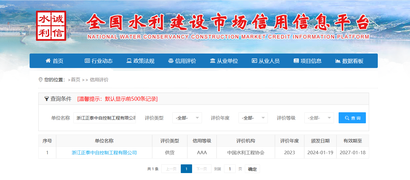 正泰中自榮獲水利建設(shè)市場主體信用AAA級(jí)供貨、信息