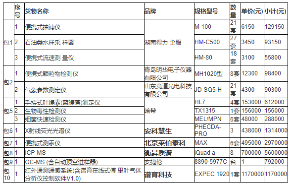 衡昇質(zhì)譜中標(biāo)8套ICP-MS,型號(hào)為iQuad a;譜育科技中標(biāo)1套紅外遙測(cè)遙感系統(tǒng),型號(hào)為EXPEC 1920;安科慧生中標(biāo)3臺(tái)X射線熒光光譜儀,型號(hào)為PHECDA-PRO;萊伯泰科中標(biāo)6套便攜式測(cè)汞儀,型號(hào)為MAX。