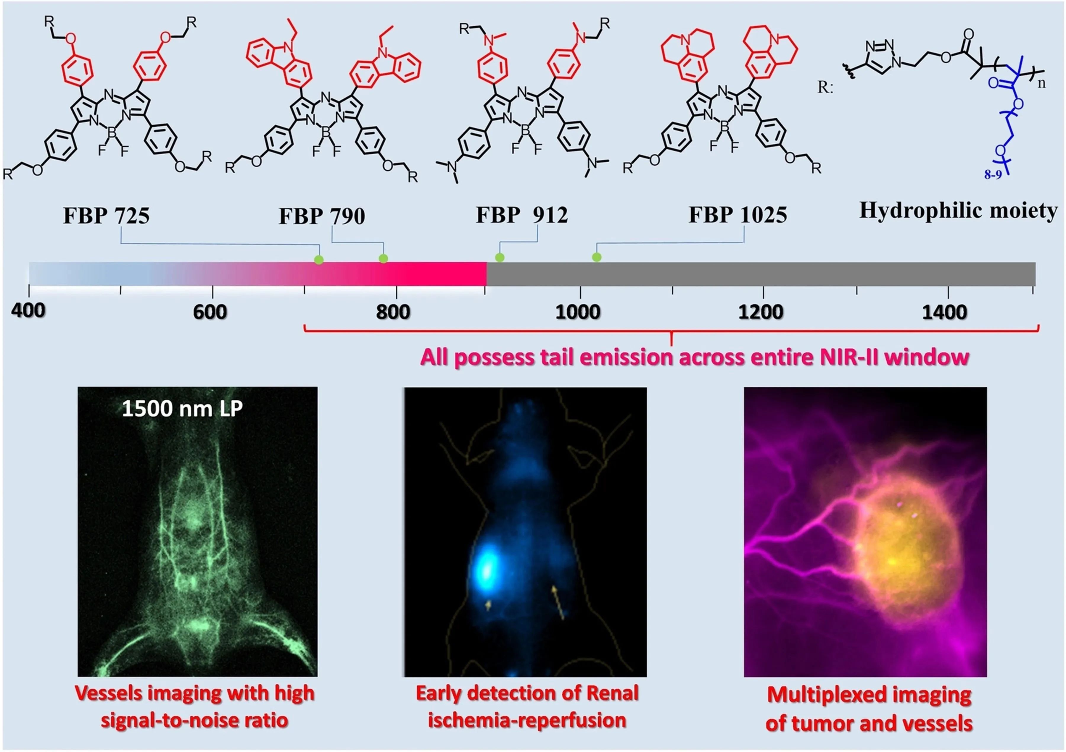 針對以上問題,張凡教授研究團(tuán)隊構(gòu)筑了一系列基于氮雜-氟硼熒(aza-BODIPY)的腎臟可清除的刷狀大分子熒光探針(命名為FBP),其發(fā)射波長從725 nm1025 nm之間可調(diào)節(jié)。優(yōu)化篩選出的FBP 912探針,其亮度(波長> 1000 nm)是目前所報道的腎臟可清除的近紅外二區(qū)有機(jī)探針的10倍左右,并且該探針在12 h內(nèi)約65%能從腎臟中代謝,能夠?qū)崿F(xiàn)對腎臟缺血再灌注損傷的早期高靈敏度檢測。FBP 912探針的血液循環(huán)時間達(dá)到6.1 h,在4T1腫瘤的被動靶向成像以及腎細(xì)胞癌主動靶向成像方面表現(xiàn)出優(yōu)異的信噪比和較長的腫瘤保留時間。