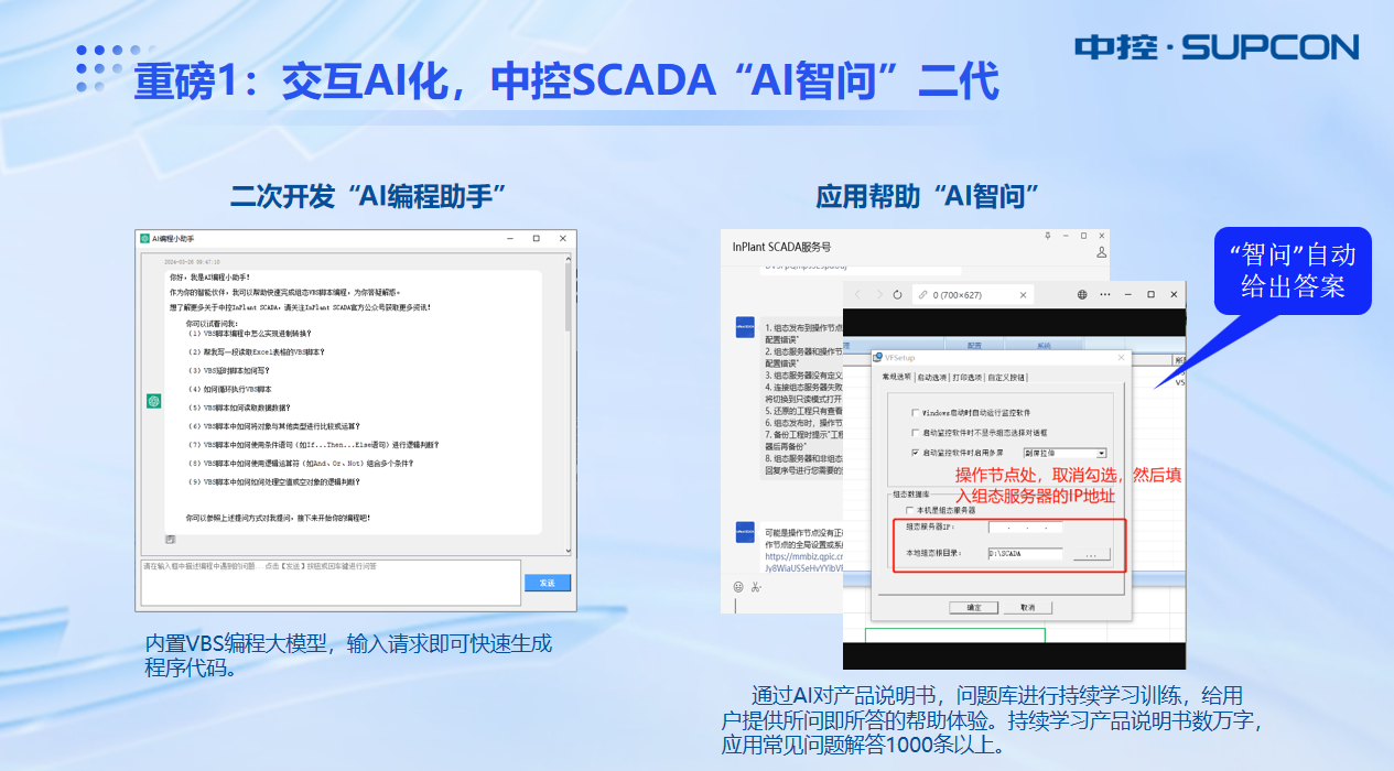 中控SCADA 6.5版本新增“AI編程助手”和“AI智問”兩種功能。“AI編程助手”內置VBS編程大模型,輸入請求即可快速生成程序代碼,能夠幫助用戶進行軟件功能的二次開發(fā)。“AI智問”經過大量訓練,已深入學習海量產品說明書及應用問題,能夠為用戶實時提供工程問題解答和指導,降低了人工答疑的時間損耗,實現(xiàn)工程搭建的效率提升。