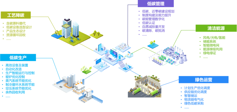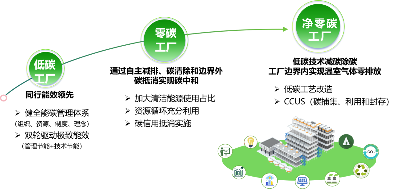 PhaseⅡ—零碳工廠:在低碳工廠的基礎(chǔ)上進(jìn)一步通過能源結(jié)構(gòu)調(diào)整、資源循環(huán)利用、碳清除、碳抵消等方式實(shí)現(xiàn)整體對(duì)外溫室氣體排放為零。