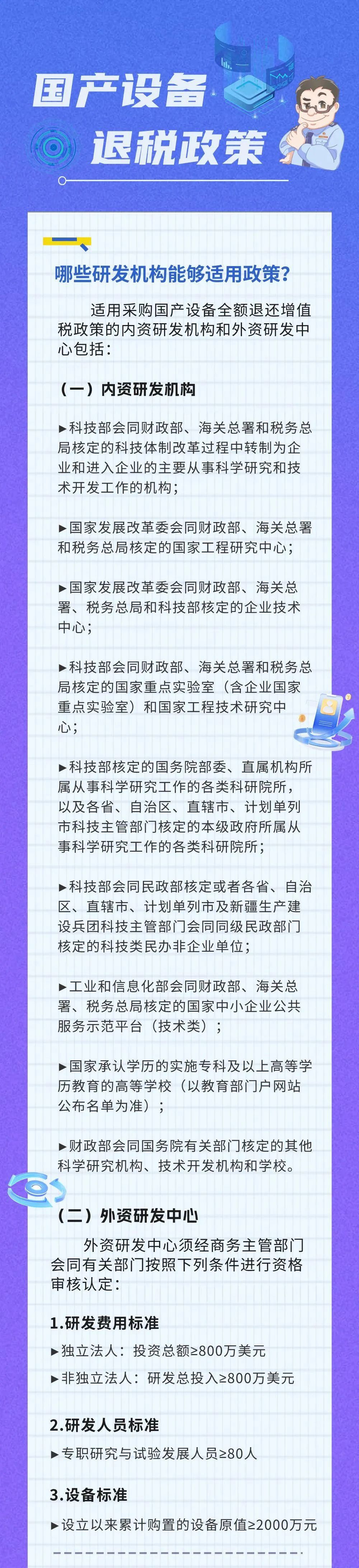 日前,財政部、商務部、稅務總局三部委聯合發文《關于研發機構采購設備增值稅政策的公告》明確指出內資研發機構和外資研發中心采購國產設備全額退還增值稅。也就是說只要是研發中心,采購國產設備,一律退回增值稅!國家在用真金白銀補貼國產設備!其中,哪些研發機構能夠適用政策?哪些國產設備能夠退還增值稅?享受退稅政策需要做哪些準備?...今天,小編帶您看看具體內容~↓↓↓