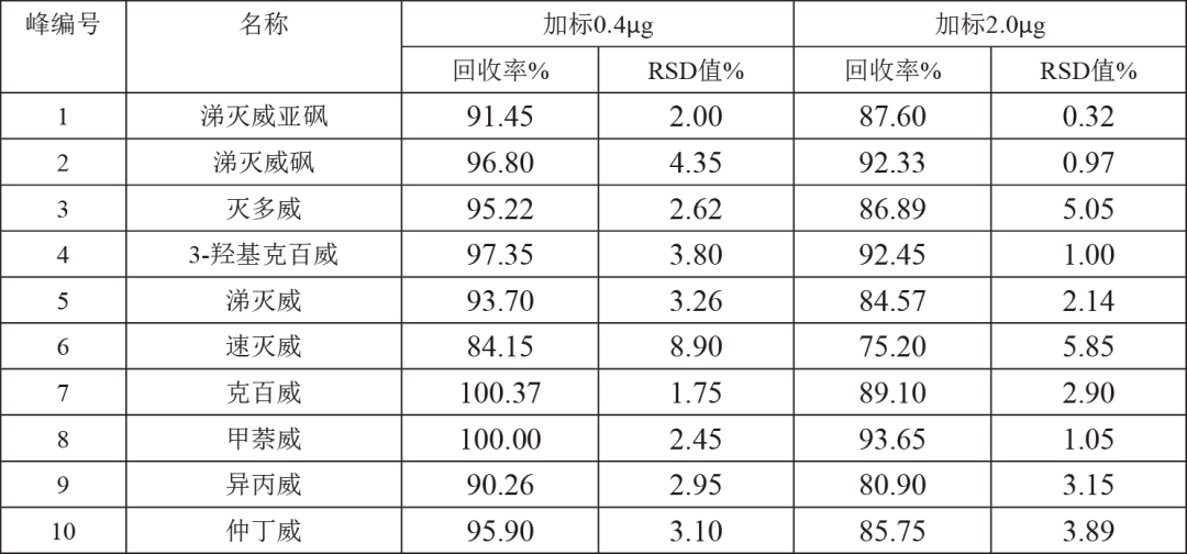 實際樣品(蘋果基質)中的10中氨基甲酸酯類農殘回收率均在84.15% ~ 100.37%之間,RSD值均小于4.35%,充分說明該方法結果準確,穩定可靠。