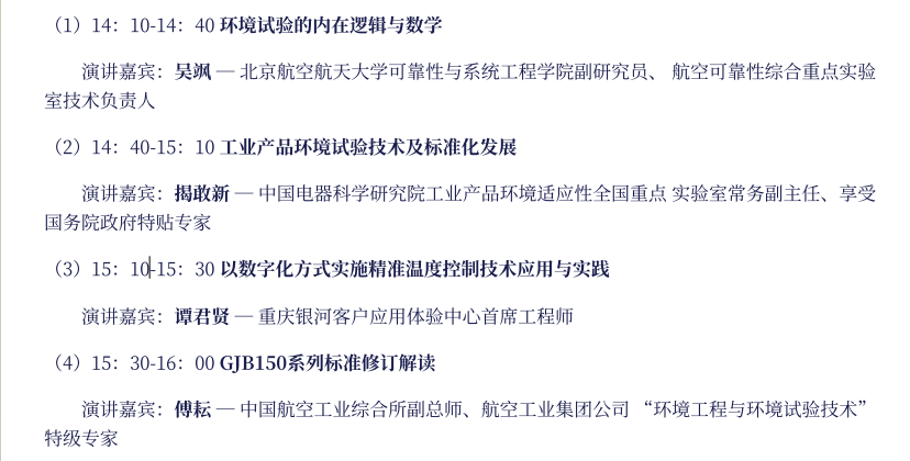 另一盛典,是由銀河儀器承辦的環境與可靠性試驗技術前沿探討與實踐應用專題論壇分會場。論壇由銀河儀器副總經理曹軍主持舉行,邀請中國儀器儀表行業協會副秘書長鄭朝松致辭;吳颯(北京航空航天⼤學可靠性與系統⼯程學院副研究員、航空可靠性綜合重點實驗室技術負責⼈)、揭敢新(中國電器科學研究院⼯業產品環境適應性全國重點實驗室常務副主任)、傅耘(中國航空⼯業綜合所副總師、航空⼯業集團公司 環境⼯程與環境試驗技術特級專家)、譚君賢(重慶銀河客⼾應⽤體驗中⼼⾸席⼯程師)等幾位行業專家在會上做分享報告。論壇現場座無虛席,人頭攢動,觀眾頻頻舉起手機拍照,在專業觀眾熱烈的掌聲中,論壇圓滿結束。