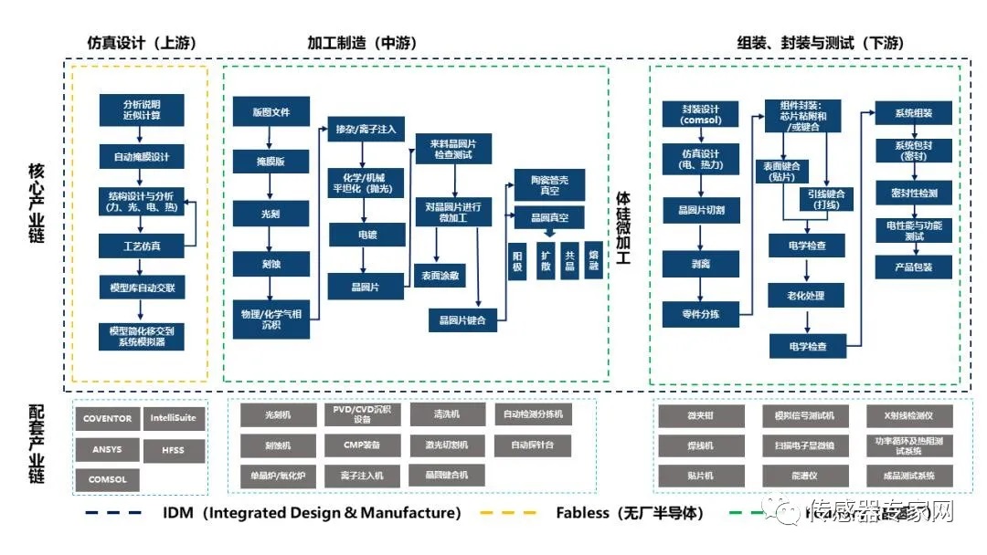 如下圖所示,智能傳感器產(chǎn)業(yè)鏈非常長(zhǎng),涉及數(shù)十個(gè)環(huán)節(jié),產(chǎn)業(yè)鏈的每個(gè)環(huán)節(jié)投入都較大,單一企業(yè)很難獨(dú)自承受產(chǎn)業(yè)鏈所有環(huán)節(jié)所需要的技術(shù)知識(shí)、人力成本及設(shè)備投入,且只有每個(gè)環(huán)節(jié)的產(chǎn)量足夠大,才能覆蓋其綜合成本,因而,智能傳感產(chǎn)業(yè)發(fā)展呈現(xiàn)出專業(yè)化、規(guī)模化和智能化的特點(diǎn),即每個(gè)環(huán)節(jié)都可成為一家獨(dú)立的公司參與到產(chǎn)業(yè)鏈的生態(tài)發(fā)展,而生產(chǎn)制造環(huán)節(jié)是所有環(huán)節(jié)中投入最大的部分。