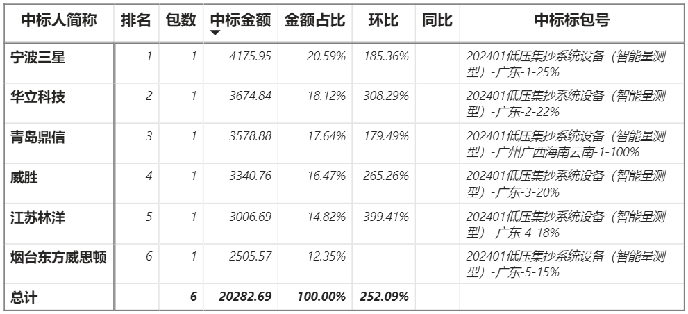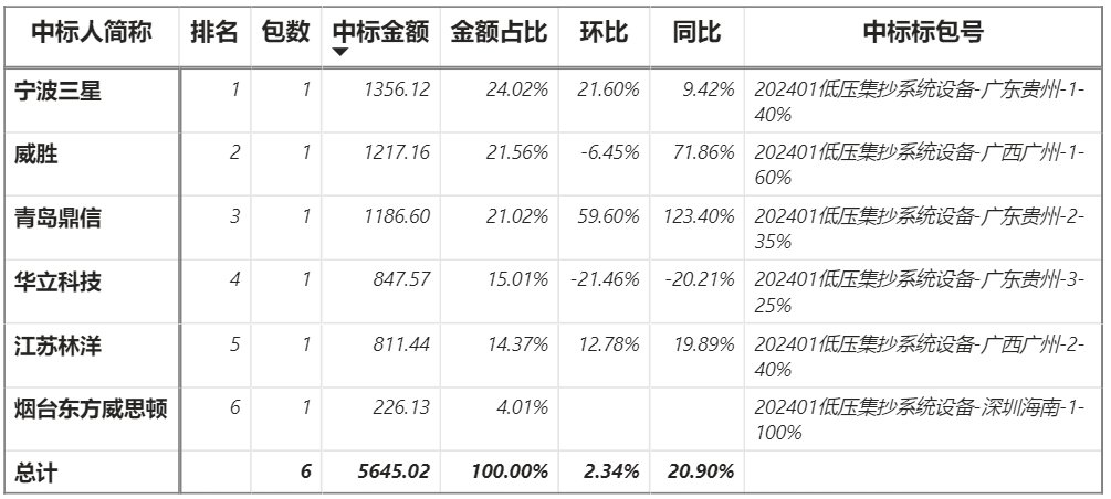總金額2.03億元,6家企業實現中標,寧波三星中標最大標包4175.95萬元;