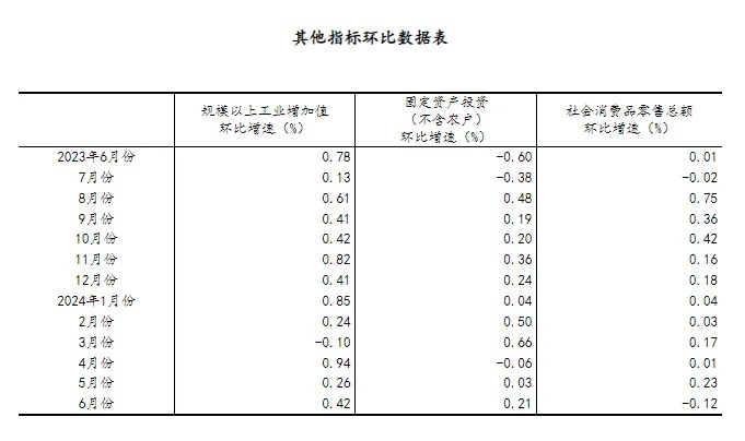 (2)根據季節調整模型自動修正結果,對近一年來各期國內生產總值、規模以上工業增加值、固定資產投資(不含農戶)、社會消費品零售總額環比增速進行修訂。修訂結果及2024年二季度GDP環比數據、2024年6月份其他指標環比數據如下: