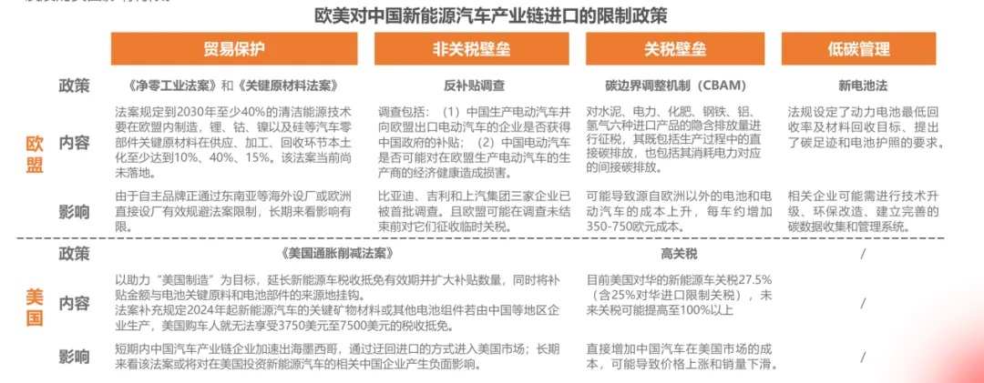 歐美近年來對中國新能源汽車產(chǎn)業(yè)鏈進口的若干限制政策摘要。霞光智庫&和君《中國新能源汽車出海十大趨勢洞察報告》,2024-5