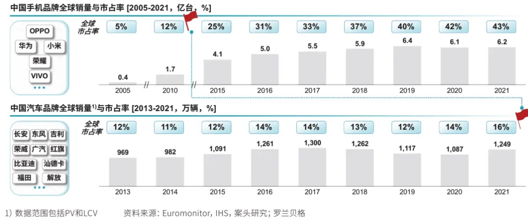 中國手機及汽車品牌發(fā)展軌跡對比。羅蘭貝格《中國車企出海白皮書》,2022-12