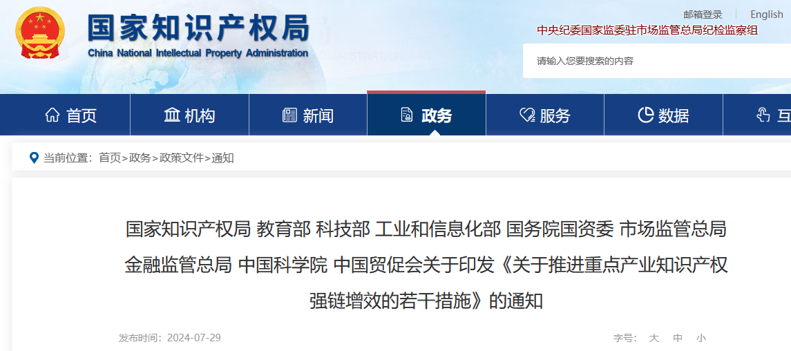 國家知識產(chǎn)權(quán)局 教育部 科技部 工業(yè)和信息化部 國務院國資委 市場監(jiān)管總局 金融監(jiān)管總局 中國科學院 中國貿(mào)促會關于印發(fā)《關于推進重點產(chǎn)業(yè)知識產(chǎn)權(quán)強鏈增效的若干措施》的通知