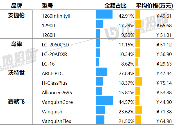 主要采購單位及對應中標品牌包括:中國科學院天津工業生物技術研究所(安捷倫),上海市動物疫病預防控制中心(沃特世),東營市食品藥品檢驗研究院(島津)等。