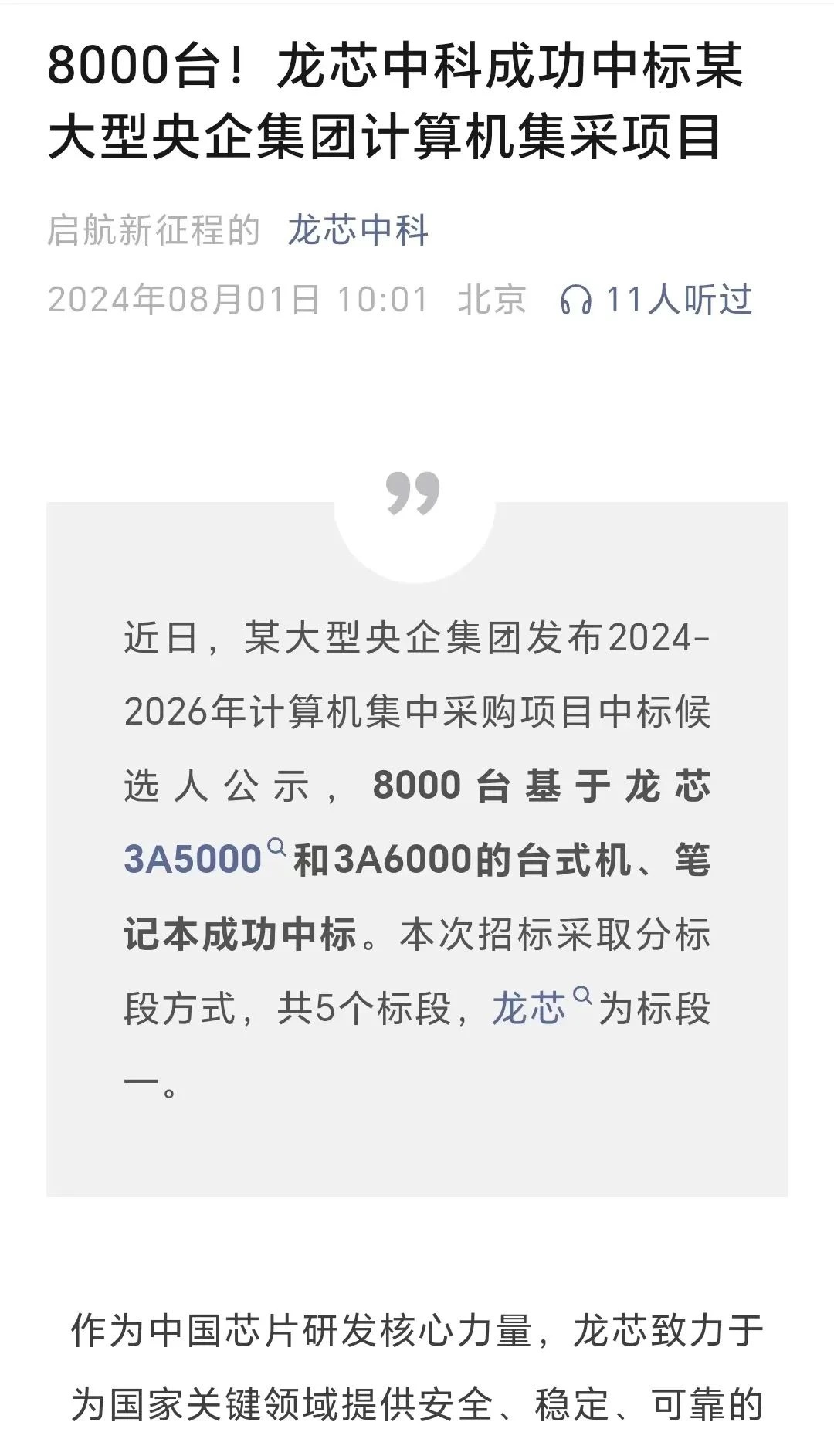 8月1日,龍芯中科在其官方微信公號中曾發(fā)文稱,近日,某大型央企集團(tuán)發(fā)布2024年-2026年計算機(jī)集中采購項目中標(biāo)候選人公示,8000臺基于龍芯3A5000和3A6000的臺式機(jī)、筆記本成功中標(biāo)。本次招標(biāo)采取分標(biāo)段方式,共5個標(biāo)段,龍芯為標(biāo)段一。