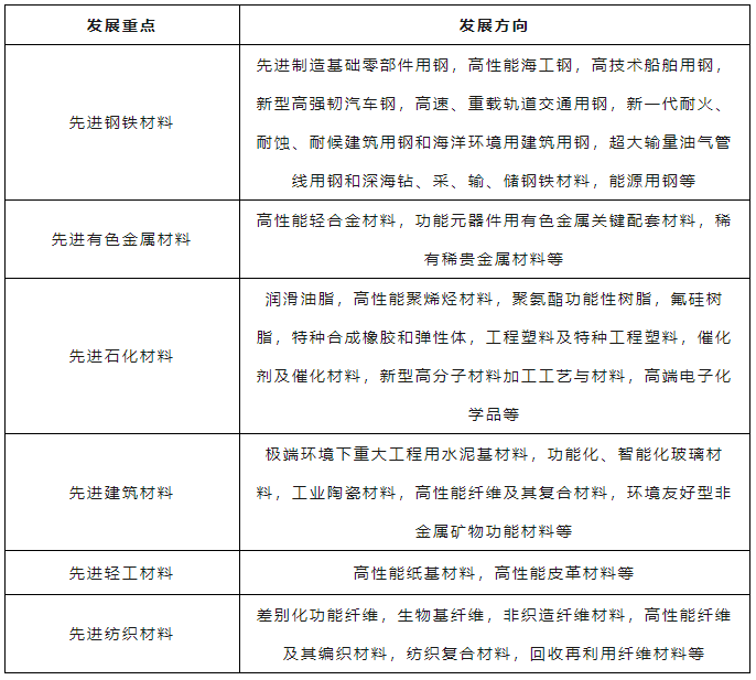 先進基礎材料領域發展重點及發展方向主要包括先進鋼鐵材料、先進有色金屬材料、先進石化材料、先進建筑材料、先進輕工材料及先進紡織材料等(見表5)。