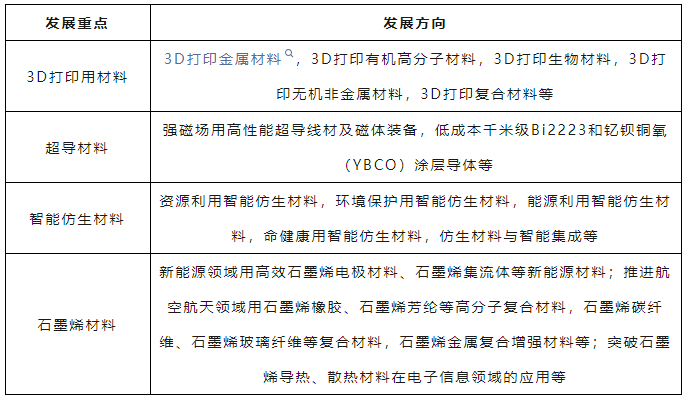 前沿新材料領域發展重點及發展方向主要包括3D打印用材料、超導材料、智能仿生材料、石墨烯材料等(見表7)。